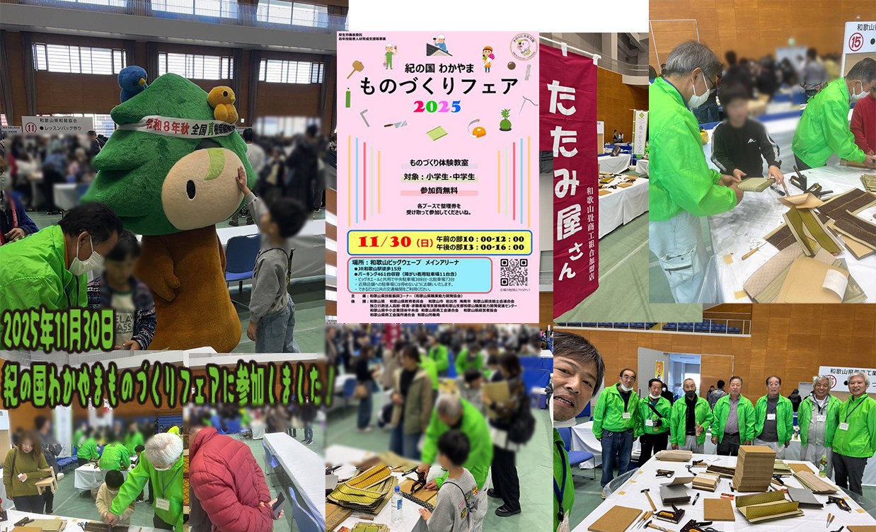 2026年1月24日に伏虎義務教育小学校にてミニ畳体験学習を行いました 2025年11月30日に紀の国わかやまものづくりフェアに参加しました! 2025年10月9日に有田川町立鳥屋城小学校4年生に「ものづくり魅力講座」を行いました 2024年12月25日に「御坊市の川辺小学校3年生のものづくり教室」に参加しました! 2024年11月8日に「太田小学校6年生のものづくり教室」に参加しました! 2024年10月26日に「紀の国わかやまものづくりフェア2024」に参加しました! 畳の標準価格 2024年10月26日「紀の国わかやまものづくりフェア2024」に参加しました! 2023年11月17日・22日と12月1日に八幡台小学校四年生のものづくり教室に参加しました! 2023年11月3日、4年ぶりの「紀の国わかやまものづくりフェア2023」大盛況でした! 2023年09月19日・22日に紀伊小学校六年生ものづくり教室に参加しました! 2023年09月12日に大新小学校四年生ものづくり教室に参加しました! 2022年10月8日に紀の国わかやまものづくり教室2022in和歌山に参加しました! 2021年12月7日・9日に砂山小学校6年生のものづくり体験教室を行いました! 2021年11月8日・9日・11日に八幡台小学校4年生のものづくり体験教室を行いました! 2021年1月15日に小倉小学校4年生のものづくり体験教室を行いました! 2020年11月9日、17日、19日に岡崎小学校5年生のものづくり体験教室を行いました! 2019年12月6日に東山東小学校でのものつくり体験教室を行いました!